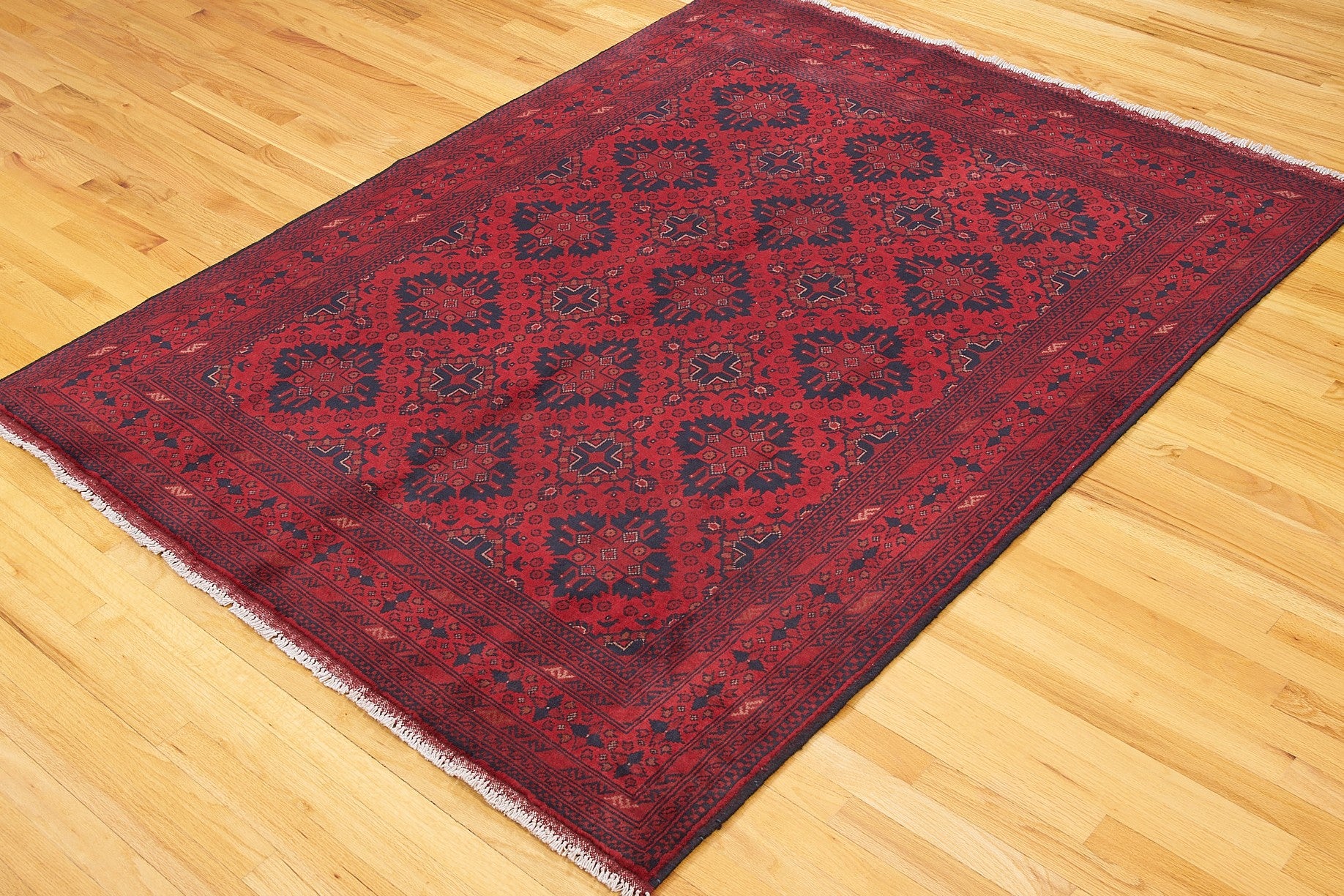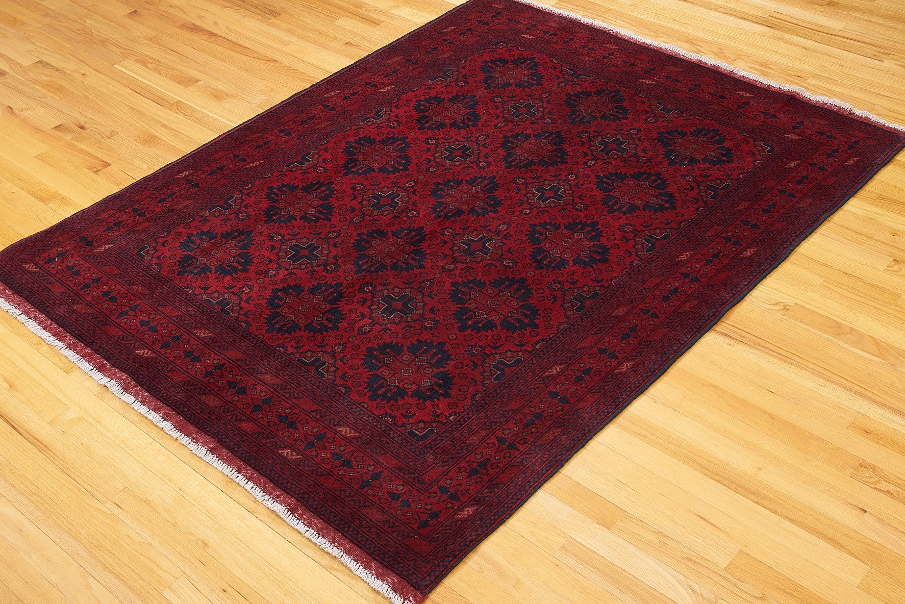 Khal Mohammadi had a business as Master Dyer in the city of Kabul in Afghanistan around 180 years ago. He started to commission a much higher grade of Afghan carpet using traditional and more unusual Afghan tribal designs that he thought would die out if not reproduced at that time. The workshop eventually was taken over by his family after his death and continued in production until the end of WW2, when the ravages of this time ceased the weaving of these remarkable quality rugs. This means that true Khal Mohammadi rugs should be over 70 years old. We currently buy these pieces in the bazaar of Peshawar in Pakistan as the refugees from the current conflict in Afghanistan bring out with them some of these wonderful examples of the weaver and dyers art. However, we also believe there is new production of these rugs which are mixed in with the older pieces at the bazaar. We also have some very fine pieces that were exclusive to a London Department store which because of their change to a very modern aesthetic they no longer take. These represent enormous value for money as they use Kork wool (the softest and longest staple wool from under the chin of the sheep) and are exceptionally good examples of these old Khals.